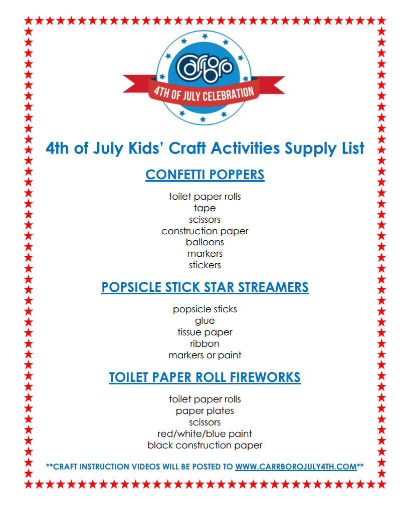 For a supply list, please visit https://www.townofcarrboro.org/DocumentCenter/View/7675/4th-of-July-Kids-Craft-Activities .